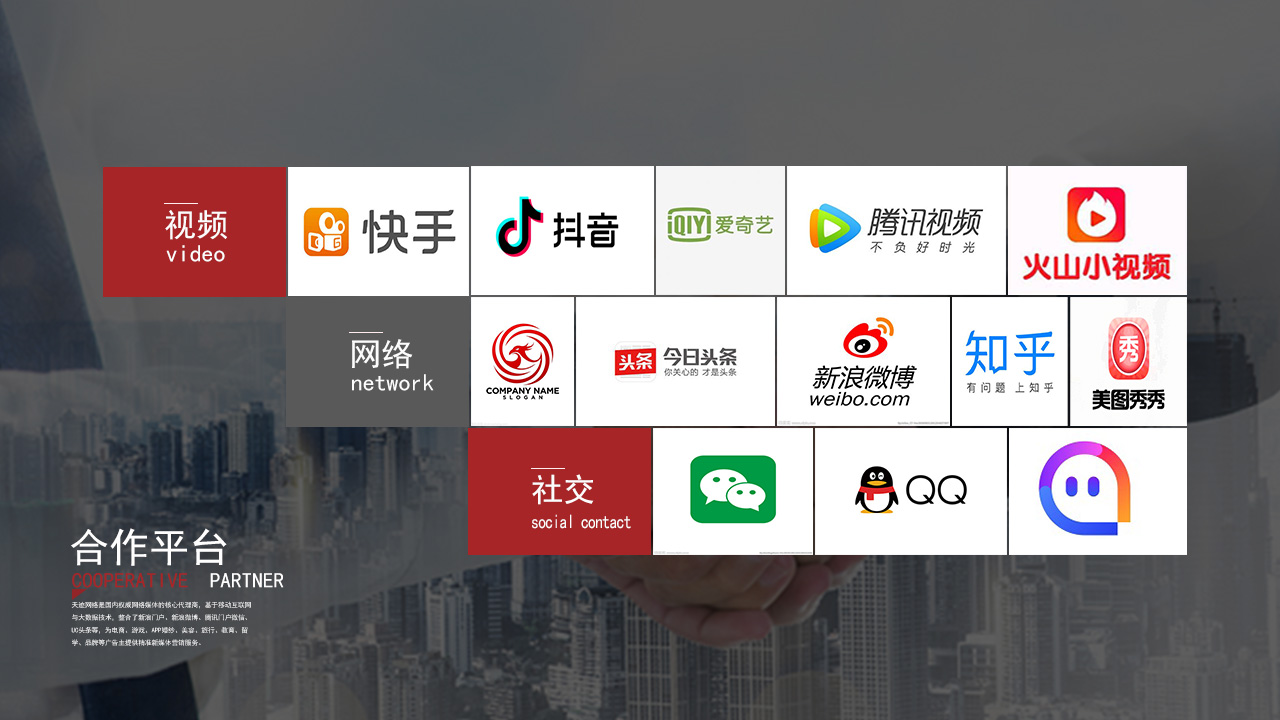 天迹网络成于2007年作为中国互联网整合营销的先行者,我们拥有10年社会化媒体营销经验,聚了一支专业的运营服务队伍服务大 中华地区超10000家企业。天迹网络是国内权威网络媒体的核心代理商,基于移动互联网与大数据技术,整合了快手、新浪微博 腾讯门户、微信、爱奇艺头条等,为电商、游戏、APP、婚纱、美容、旅行、教育、留学品牌等广告主提供精准新媒体营销服务。