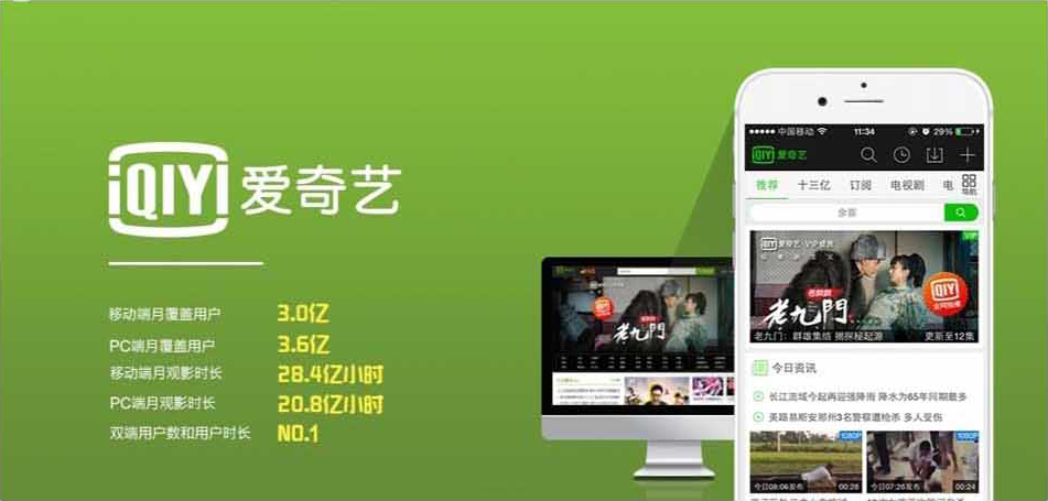 据2017年调查报告,爱奇艺用户达2.69亿,观看时长26亿小时,每天活跃用户达1.69亿,占互联网视频用户的60%,人均在线时长第一;